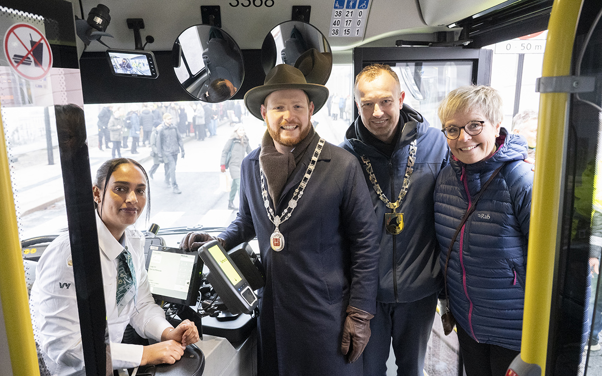 FØRSTE BUSSTUR: Den første bussturen opp Kongens gate, her med sjåfør Mlete Habte og Marius Roheim Aarvold, ordfører Skien, Sven Tore Løkslid, fylkesordfører Telemark og Elisabeth Hammer, ordfører Siljan. (Foto: Dag Jenssen)