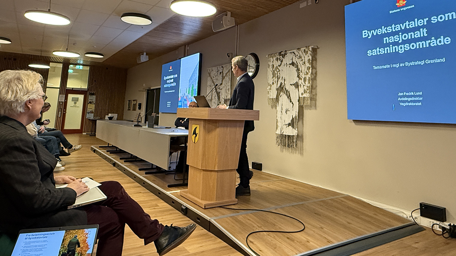Jan Fredrik Lund, avdelingsdirektør Strategi i Vegdirektoratet snakket om Byvekstavtaler som nasjonalt satsingsområde. (Foto: Birgitte Hellstrøm)